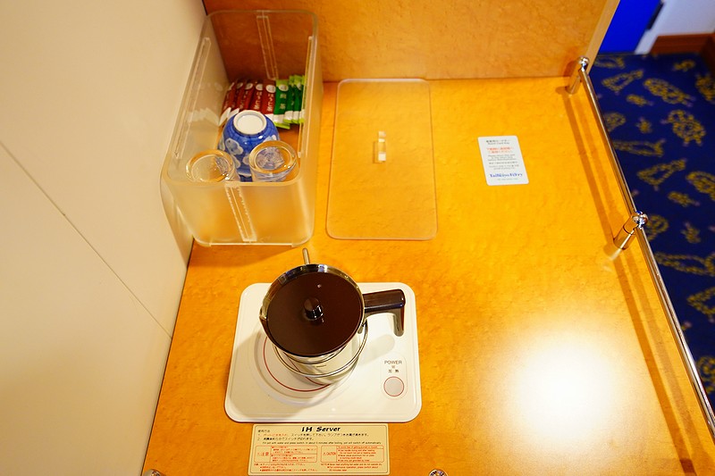 お茶セットも用意されています。コーヒーはありません。ポットがない代わりにコップで熱湯が作れるようになっています。