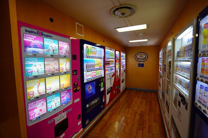 5階にはアルコール類、ノンアルコール類、、自販機がそろったコーナーがちゃんとあります。値段もペットボトル180円、缶コーヒー140円なので街の自販機と特に遜色ありません。船内に乗り込んでから飲み物を買っても問題なしです。