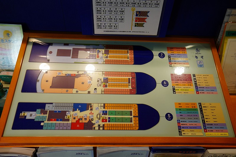 ここで船内マップを。基本的に乗客スペースは3階構造になっていまして、5階にはドライバー室、2等、B寝台、S寝台、1等が配置されています。2等は雑魚寝部屋、寝台はドアはないけど、カプセルホテルみたいな構造、1等は個室です。あとこの階には大浴場や売店、ゲーセン、カラオケルームなどがありまして、ちょっと大衆的な雰囲気があります。