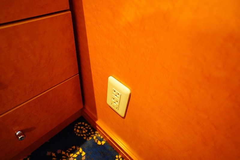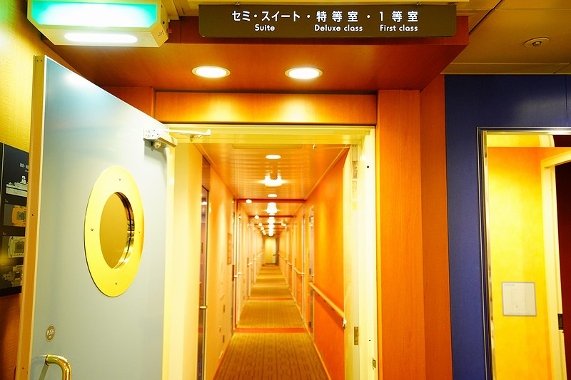 自分の部屋から廊下への入口方面を眺めるとこんな感じ。右側が特等(外向きの窓あり)、左側が1等(内向きの窓なし)です。1等でも窓ありの部屋もあります。