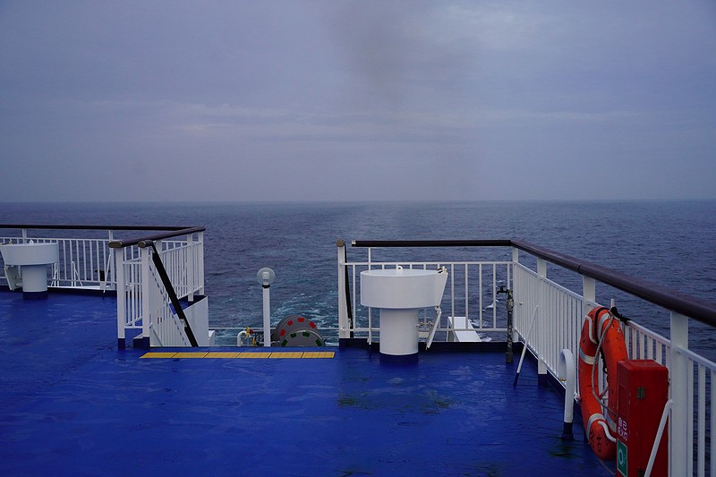 進行方向後ろを眺めてみると黒い煙が流れていきます。この船を名古屋から苫小牧まで運航するのにどれだけの燃料を使うのか。想像しただけで環境に悪そうです。飛び恥とは言いますが、船は遅い割に大きいので恐らく燃料消費は半端なく大きいです。飛行機なんかよりもよっぽど船が乗り恥なんじゃないかと思います。